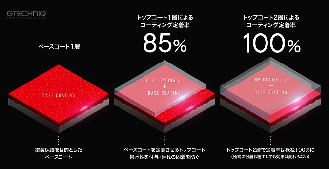 ベースコート1層とトップコート2層でトータル3層の強靱なセラミック皮膜を施工します。ソフトなベースコートが塗装面の凹凸に密着しスムースな面を構成。外側のハードなトップコートが強固に守ります。撥水角は驚異の112度!雨の日は、まん丸な水滴が転がる様子を楽しんで下さい。 |